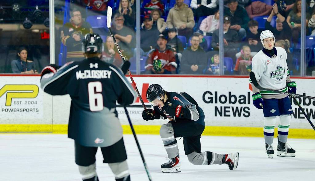 Morgan Hackman of the Humboldt Broncos crunches Battlefords player through rink glass